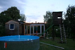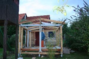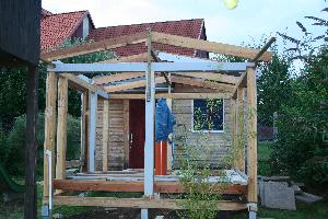 Hier ein paar Bilder vom Aufbau der Hütte. Die Balken waren zu 99% gebraucht aus einem alten Wintergarten.